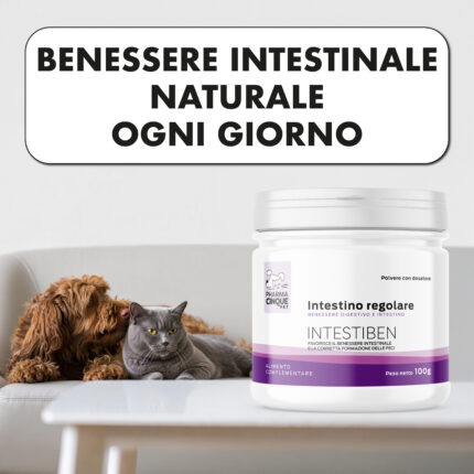 Intestiben polvere da mescolare al cibo con probiotici e prebiotici, con Psillio e Opuntia.